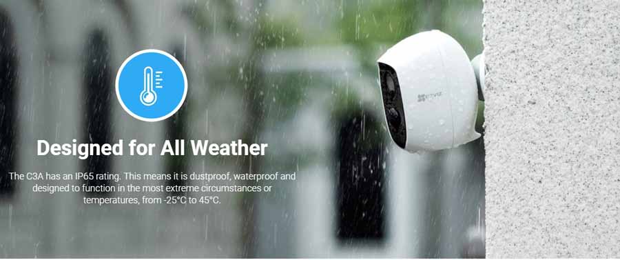 Camera EZVIZ C3A có xếp hạng IP65. Điều này có nghĩa là nó có khả năng chống bụi, chống thấm nước và được thiết kế để hoạt động trong những hoàn cảnh hoặc nhiệt độ khắc nghiệt nhất, từ -25° C đến 45° C.