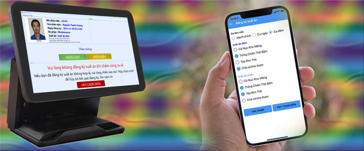 Máy Pos này đặt cạnh máy chấm công. Khi công nhân chấm công thì sẽ đăng ký món ăn luôn tại máy Pos bên cạnh máy chấm công. Tùy chọn, có thể không dùng máy Pos và thay thế sử dụng đăng ký món ăn thông qua app điện thoại Android hoặc iOS. Cũng có thể dùng song song Máy Pos đặt dưới xưởng cho công nhân đăng ký và dùng app điện thoại để đăng ký ở bất kỳ nơi nào