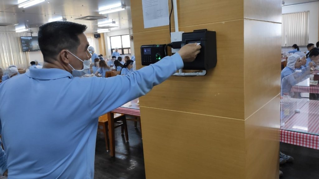 1 máy trang bị ở dưới xưởng để công nhân chấm công và đăng ký món ăn hàng ngày