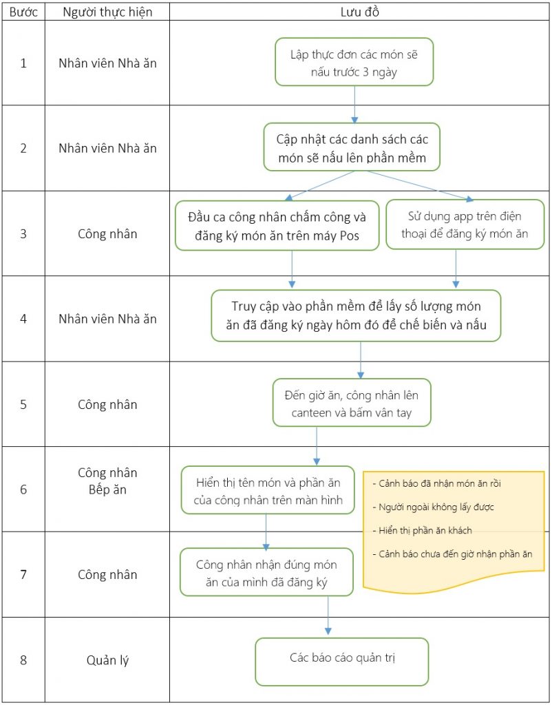 Đến giờ ăn, công nhân lên canteen và bấm vân tay. Sau khi xác thực vân tay thành công, hệ thống sẽ hiển thị tên món và phần ăn của công nhân trên màn hình. Cảnh báo nếu đã nhận món ăn rồi, hiển thị thông tin trên màn hình để báo cho nhà bếp biết. Người lạ từ bên ngoài vào sẽ không lấy được phần ăn vì không xác thực được vân tay. Hiển thị phần ăn khách