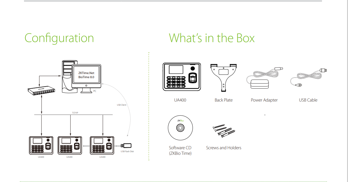 Máy chấm công vân tay và thẻ ZKTeco UA400 được thiết kế sang trọng, trọng lượng máy mỏng, nhẹ rất thích hợp cho các công ty văn phòng, nhà xưởng. Với dung lượng 3000 vân tay, có thêm chức năng thẻ phù hợp cho các công ty khoảng 2000 nhân viên .