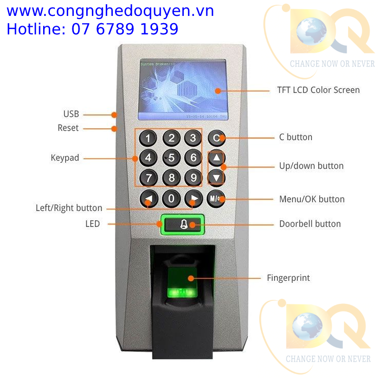- Máy chấm công kiểm soát cửa bằng thẻ + vân tay F18: dùng đề chấm công nhân viên, quản lý thông tin nhân viên ( ID nhân viên, vân tay, mật khẩu mở cửa, quyền truy ra vào cửa…), ghi nhận thời gian ra vào cửa của từng nhân viên vào bộ nhớ của máy và điều khiển khóa cửa điện tử.
