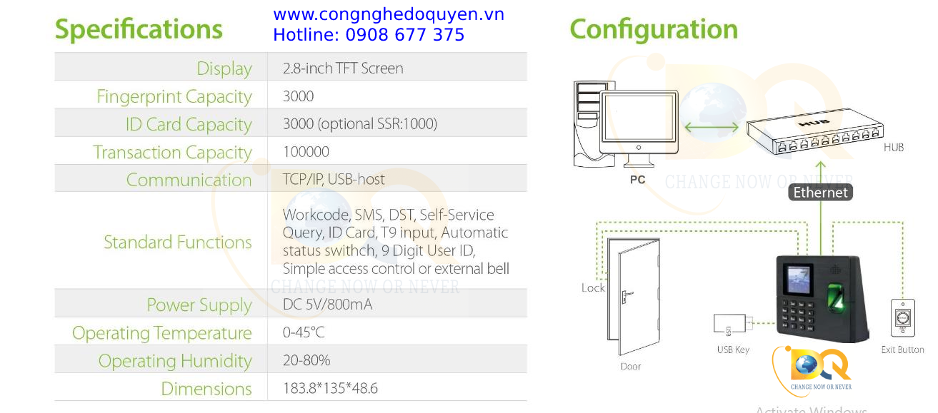 Kết nối: TCP/IP, USB, Password bảo vệ máy